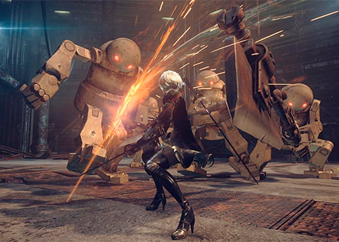 El combate es en tiempo real, basado en combinaciones de ataques ligeros y pesados. El jugador puede esquivar con precisión para ganar invulnerabilidad o contraatacar, y cuenta con un robot de apoyo, llamado Pod, que lanza ataques a distancia personalizables. El sistema de armas incluye espadas cortas, espadas largas, lanzas y brazales, y cada tipo ofrece ataques que pueden cargarse para causar más daño. Los tres protagonistas tienen estilos de combate únicos: 2B alterna entre armas, 9S puede hackear enemigos, y A2 puede aumentar su poder sacrificando salud temporalmente.